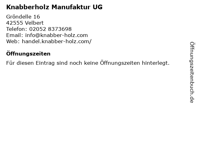 | Öffnungszeiten Knabberholz Manufaktur UG in Velbert anzeigen | |