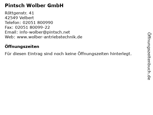 | Öffnungszeiten Pintsch Wolber GmbH in Velbert anzeigen | |