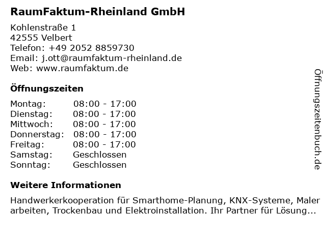 | Öffnungszeiten RaumFaktum-Rheinland GmbH in Velbert anzeigen | |