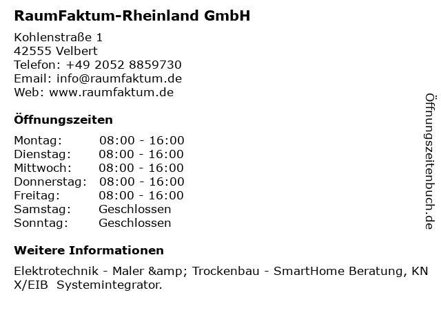 | Öffnungszeiten RaumFaktum-Rheinland GmbH in Velbert anzeigen | |