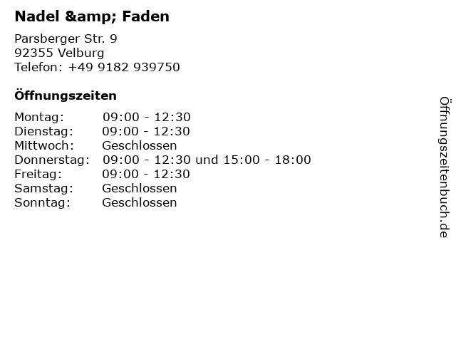 | Öffnungszeiten Nadel & Faden in Velburg anzeigen | |