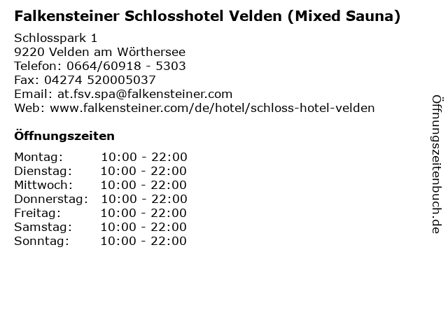 2 Falkensteiner Schlosshotel Velden (Spa Bistro) (Entfernung: 0,00 km) Schlosspark 1, 9220 Velden am Wörthersee 3 Falkensteiner Schlosshotel Velden (Spa Behandlungen ) (Entfernung: 0,00 km) Schlosspark 1, 9220 Velden am Wörthersee 6 |