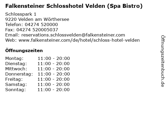 1 Falkensteiner Schlosshotel Velden (Spa Behandlungen ) (Entfernung: 0,00 km) Schlosspark 1, 9220 Velden am Wörthersee 3 Falkensteiner Schlosshotel Velden (Mixed Sauna) (Entfernung: 0,00 km) Schlosspark 1, 9220 Velden am Wörthersee 6 |