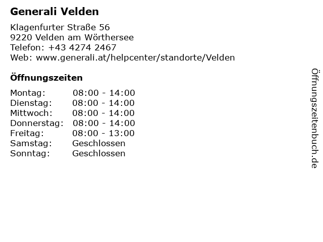 | Öffnungszeiten Generali Velden in Velden am Wörthersee anzeigen | |