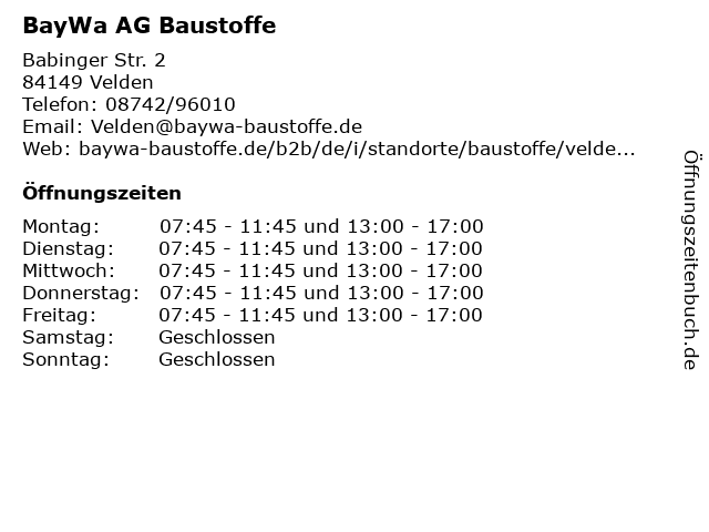| Öffnungszeiten BayWa AG Baustoffe in Velden anzeigen | |