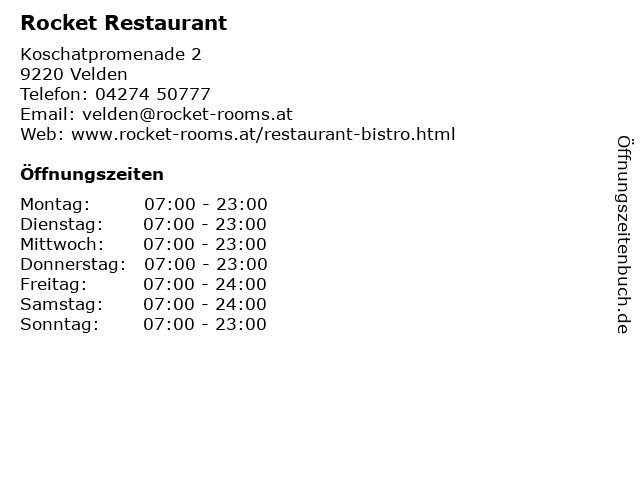 | Öffnungszeiten Rocket Restaurant in Velden anzeigen | |