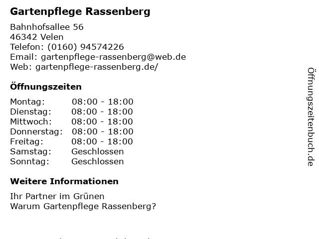 | Öffnungszeiten Gartenpflege Rassenberg in Velen anzeigen | |