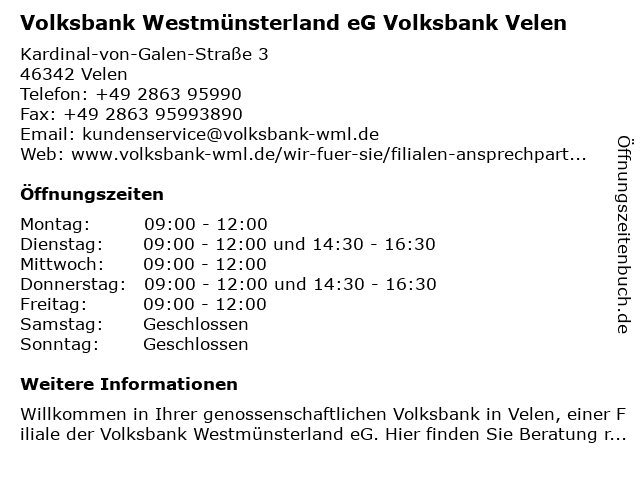 1 Geldautomat Volksbank Westmünsterland eG (Entfernung: 0,01 km) Kardinal-von-Galen-Straße 3, 46342 Velen 2 Sparkasse Westmünsterland (Geldautomat) (Entfernung: 0,09 km) Kardinal-von-Galen-Straße 13-15, 46342 Velen 3 Sparkasse Westmünsterland (Beratungscenter) (Entfernung: 0,09 km) Kardinal-von-Galen-Straße 13-15, 46342 Velen 6 egw Entsorgungs-Gesellschaft Westmünsterland - Informationszentrum (Entfernung: 6,03 km) Estern 41, 48712 Gescher |