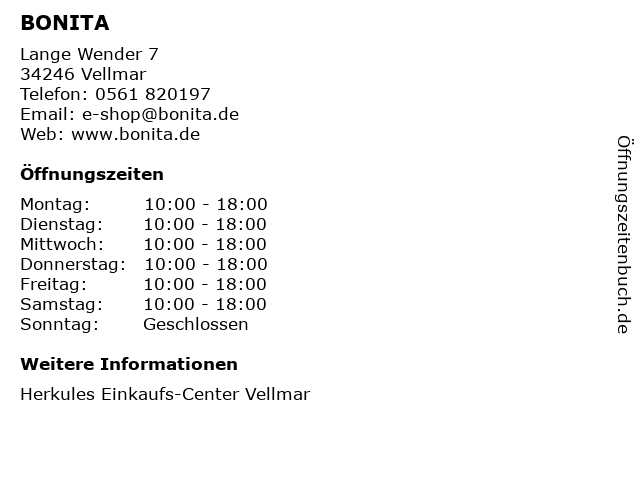 | Öffnungszeiten BONITA in Vellmar anzeigen | |