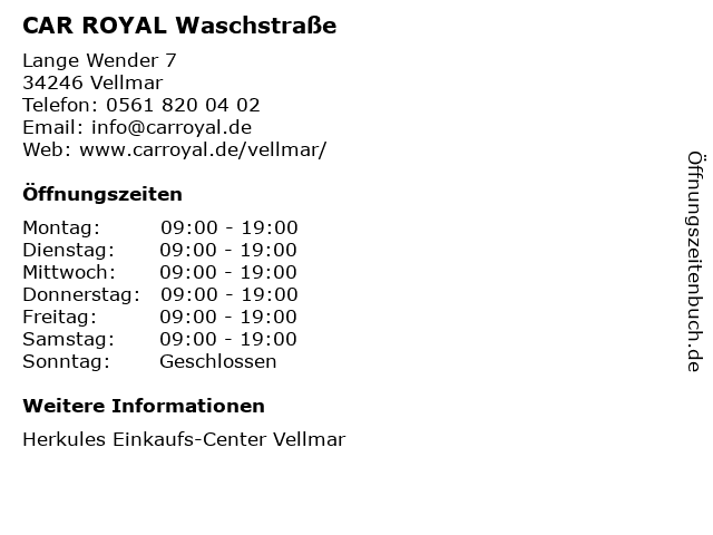 | Öffnungszeiten CAR ROYAL Waschstraße in Vellmar anzeigen | |
