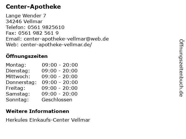 | Öffnungszeiten Center-Apotheke in Vellmar anzeigen | |