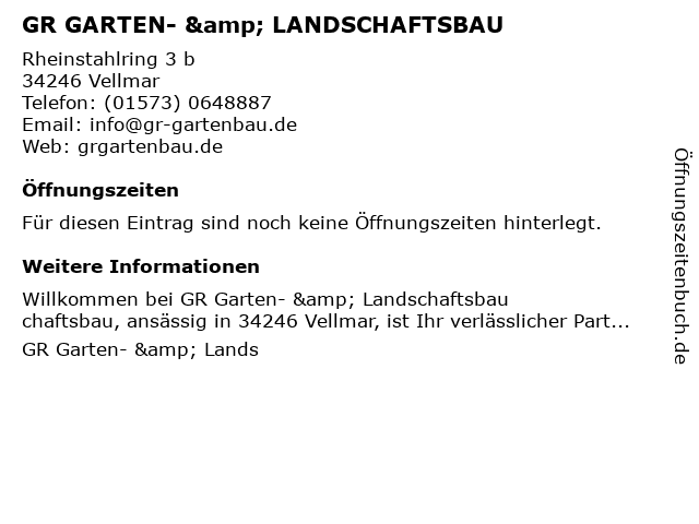 | Öffnungszeiten GR GARTEN- & LANDSCHAFTSBAU in Vellmar anzeigen | |