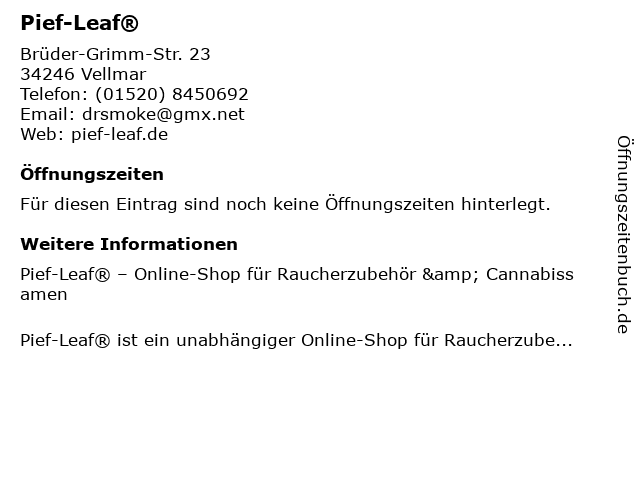 | Öffnungszeiten Pief-Leaf® in Vellmar anzeigen | |