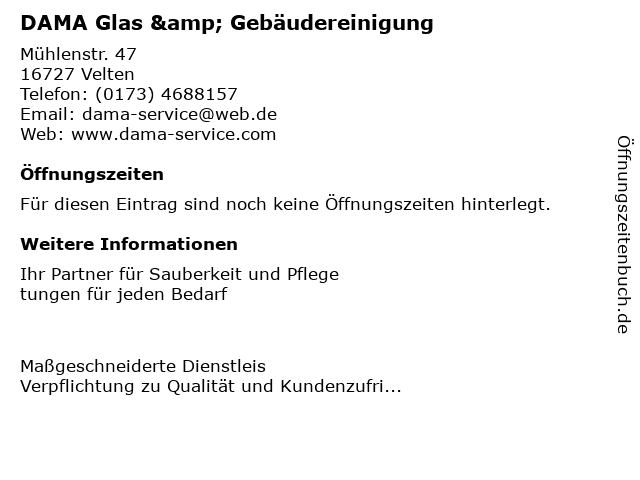 | Öffnungszeiten DAMA Glas & Gebäudereinigung in Velten anzeigen | |