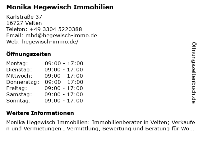 | Öffnungszeiten Monika Hegewisch Immobilien in Velten anzeigen | |