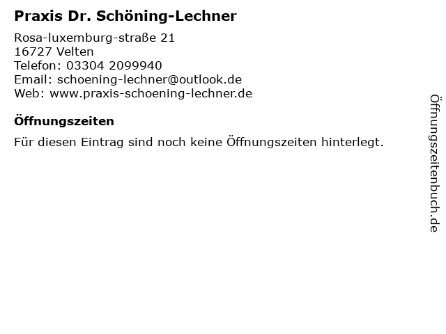 | Öffnungszeiten Praxis Dr. Schöning-Lechner in Velten anzeigen | |