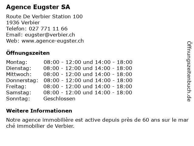 | Öffnungszeiten Agence Eugster SA in Verbier anzeigen | |