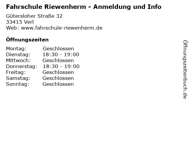 | Öffnungszeiten Fahrschule Riewenherm - Anmeldung und Info in Verl anzeigen | |