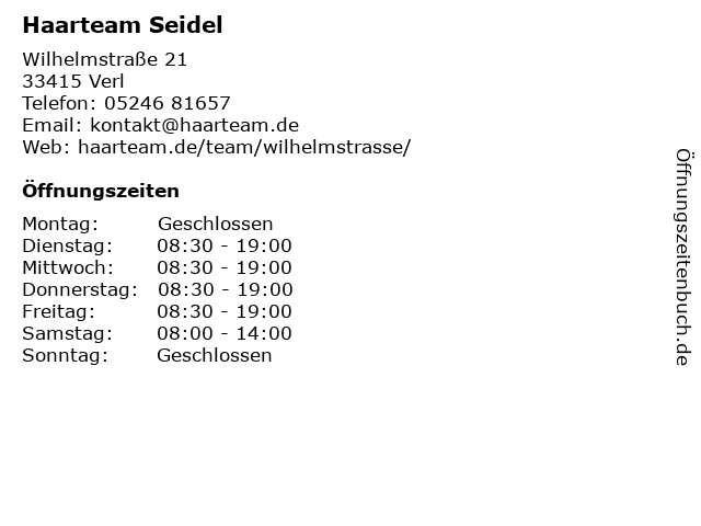 | Öffnungszeiten Haarteam Seidel in Verl anzeigen | |
