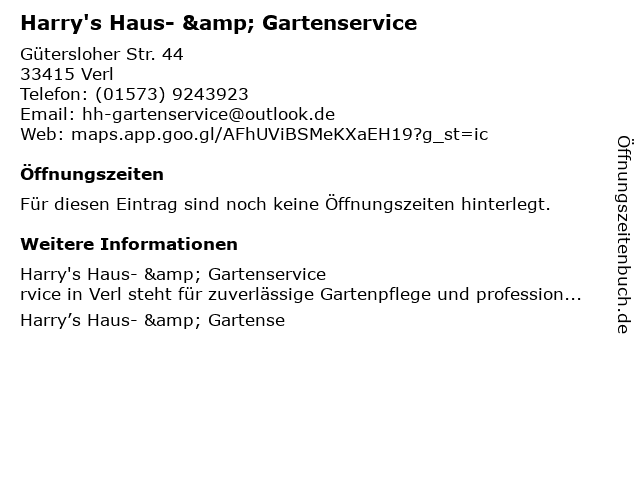 | Öffnungszeiten Harry's Haus- & Gartenservice in Verl anzeigen | |