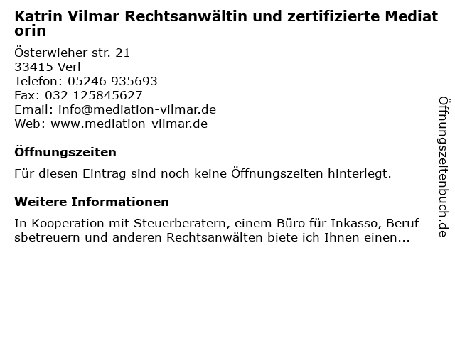 | Katrin Vilmar Rechtsanwältin und zertifizierte Mediatorin anrufen | |