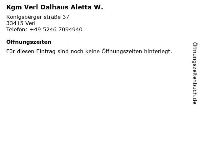 | Öffnungszeiten Kgm Verl Dalhaus Aletta W. in Verl anzeigen | |