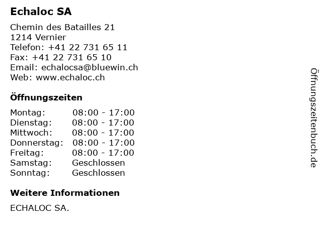 | Öffnungszeiten Echaloc SA in Vernier anzeigen | |