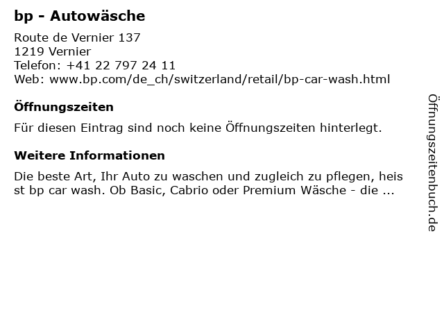 | Telefonnummer bp - Autowäsche in Vernier (+41 22 797 24 11) anrufen | |