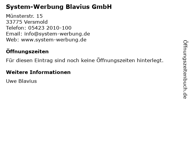 | Öffnungszeiten System-Werbung Blavius GmbH in Versmold anzeigen | |