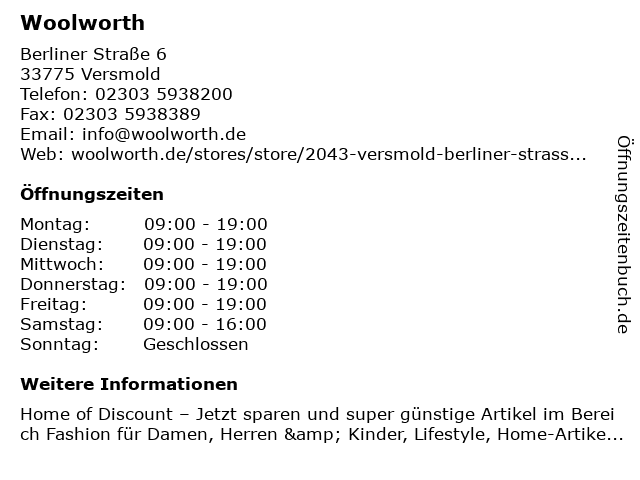 | Öffnungszeiten Woolworth in Versmold anzeigen | |