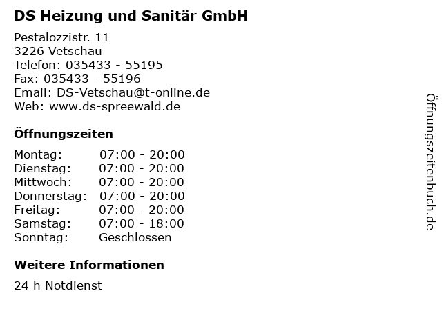 | Öffnungszeiten DS Heizung und Sanitär GmbH in Vetschau anzeigen | |