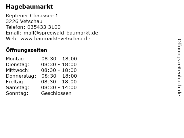 | Öffnungszeiten Hagebaumarkt in Vetschau anzeigen | |