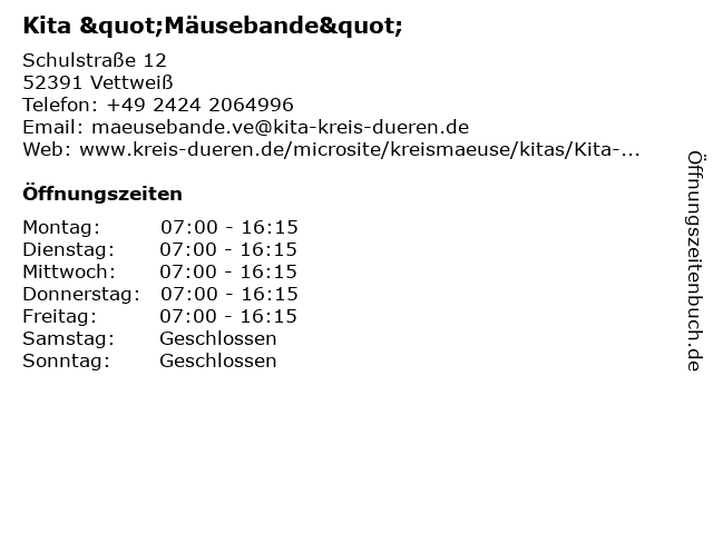 | Öffnungszeiten Kita "Mäusebande" in Vettweiß anzeigen | |
