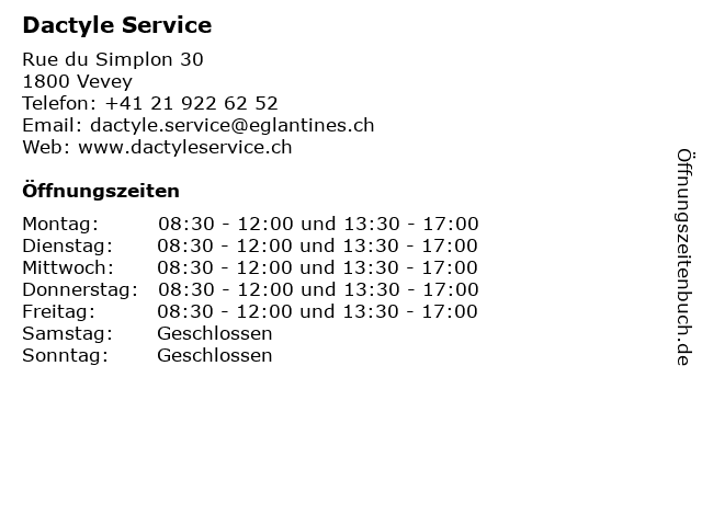 | Öffnungszeiten Dactyle Service in Vevey anzeigen | |