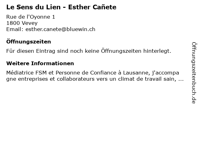 | Öffnungszeiten Le Sens du Lien - Esther Cañete in Vevey anzeigen | |