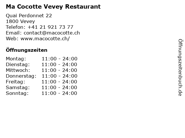 | Öffnungszeiten Ma Cocotte Vevey Restaurant in Vevey anzeigen | |