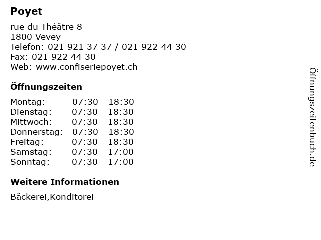 | Öffnungszeiten Poyet in Vevey anzeigen | |