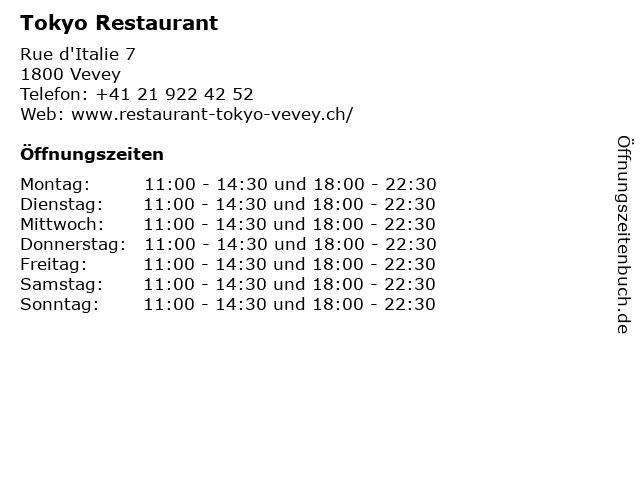 | Öffnungszeiten Tokyo Restaurant in Vevey anzeigen | |