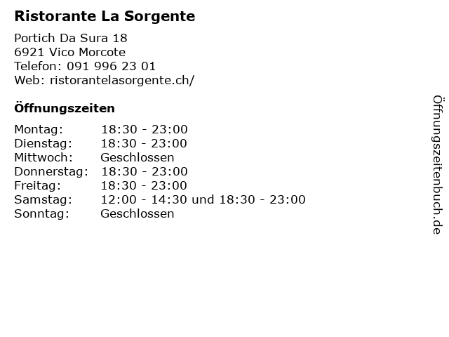 | Öffnungszeiten Ristorante La Sorgente in Vico Morcote anzeigen | |