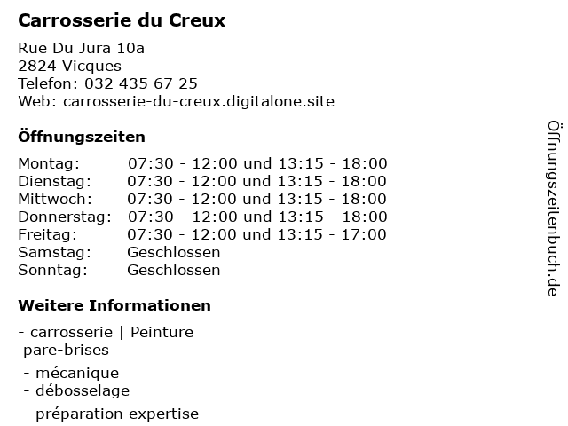 | Öffnungszeiten Carrosserie du Creux in Vicques anzeigen | |