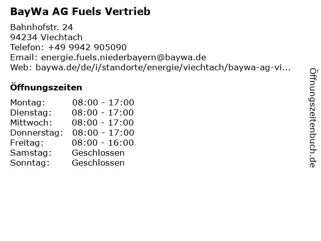 | Öffnungszeiten BayWa AG Fuels Vertrieb in Viechtach anzeigen | |