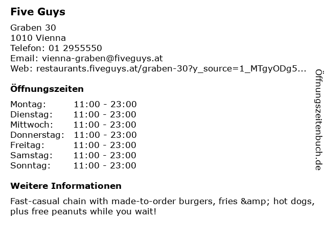 | Öffnungszeiten Five Guys in Vienna anzeigen | |