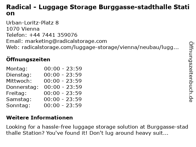 Branchen & Suchbegriffe zu Radical - Luggage Storage Burggasse-stadthalle Station:burggasse, luggage, luggage storage, luggage storage near me, radical, stadthalle, station, storage |