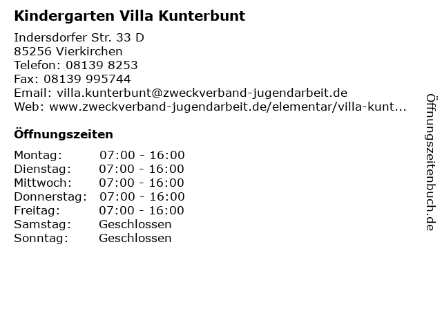 5 Spielwiese Kunterbunt Kindertagesstätte (Entfernung: 17,63 km) Auf den Schrederwiesen 71c, 80995 München 6 Kinderzentren Kunterbunt gGmbH Regionalbüro (Entfernung: 17,69 km) Auf den Schrederwiesen 71c, 80995 München |