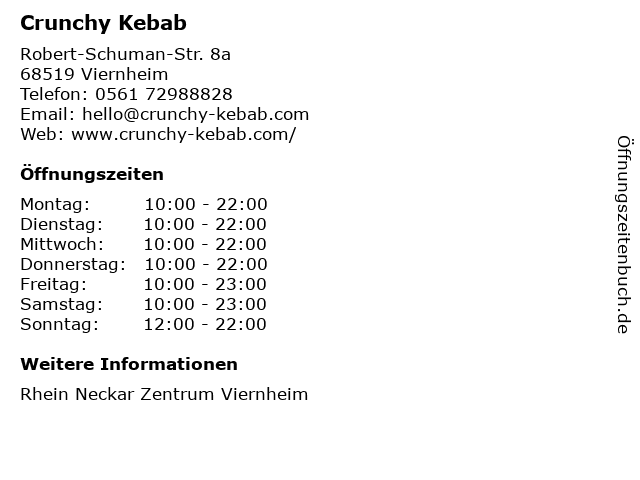 | Öffnungszeiten Crunchy Kebab in Viernheim anzeigen | |