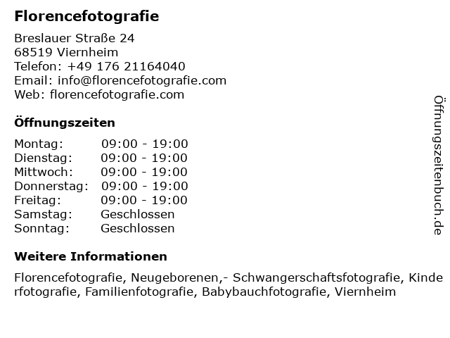| Öffnungszeiten Florencefotografie in Viernheim anzeigen | |