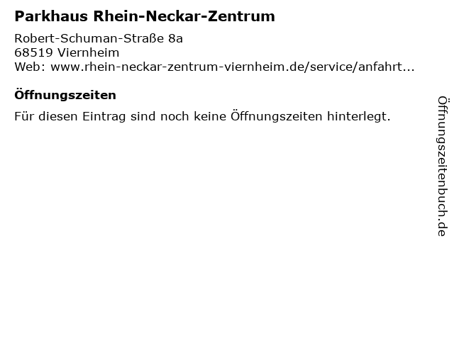 | Öffnungszeiten Parkhaus Rhein-Neckar-Zentrum in Viernheim anzeigen | |