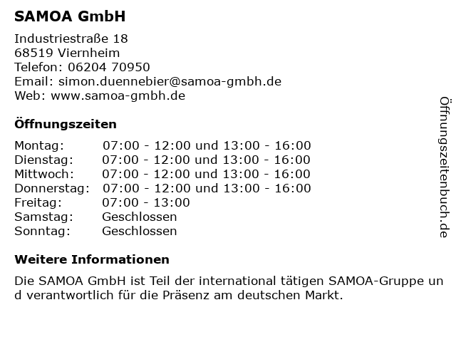| Öffnungszeiten SAMOA GmbH in Viernheim anzeigen | |