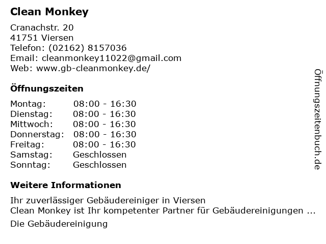 | Öffnungszeiten Clean Monkey in Viersen anzeigen | |