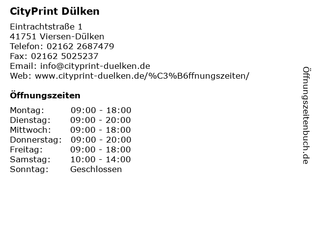| Öffnungszeiten CityPrint Dülken in Viersen-Dülken anzeigen | |